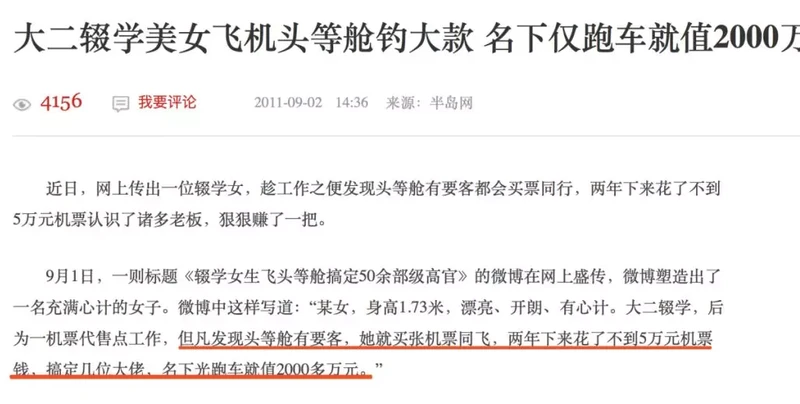 2011年,网上传出一位在机票代售点工作的女生,利用工作之便,但凡发现头等舱有要客,她便会买张机票同飞,“两年下来花了不到5万元机票钱,轻易搞定几位大佬,名下光跑车就值2000多万元。”
